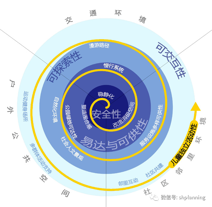 在社区邻里环境方面,社会经济水平、土地利用混合度、学校社区服务设施、邻里氛围、家庭内部空间等因素对儿童独立活动性都有一定影响。成熟、积极的社区邻里环境被证明能够直接促进儿童独立活动性,其主要体现为社区环境的安全性、服务设施的可达性与可参与性,并强调环境改善与社区文化的相互配合。