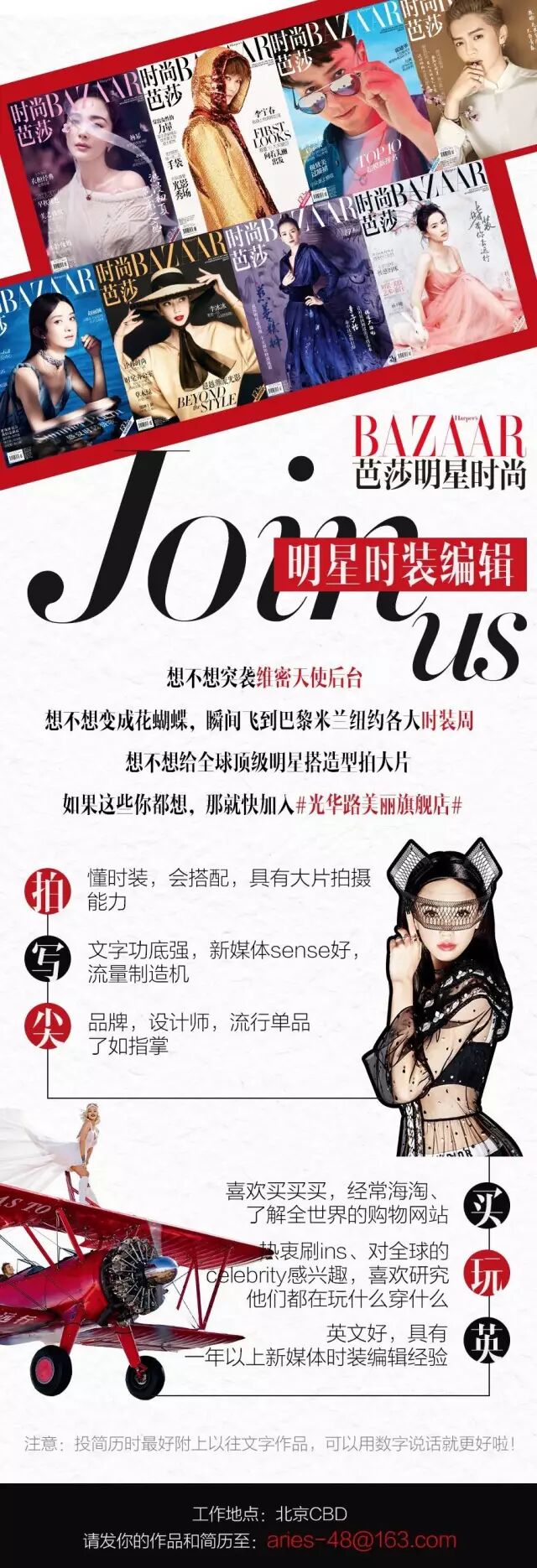 Attention!芭姐team终于又又又又又又又招聘啦!如果你想亲手打开Angelababy的化妆包,想突袭维秘天使后台,想跟时尚女模头面对面头脑风暴,在纽约米兰巴黎各大时装周飞来飞去,就赶快投简历加入我们光华路美丽旗舰店吧!