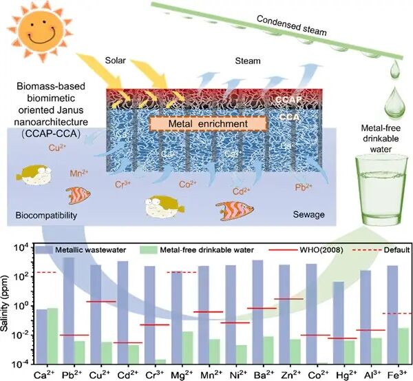 自然界的植物进行光合作用过程中,通过植物茎内的定向结构,将水分和营养成分从根部运输到叶部,同时伴随着水分的不断蒸发,营养成分(包括各种金属离子)会在植物体内不断富集(图1)。受植物中取向结构增强水和金属离子运输能力的启发,中国科学技术大学俞书宏院士、陈立锋教授团队利用资源丰富、成本低廉的生物质基前驱材料,借助冰模板法开发出一种生物质基仿生取向非对称结构光热水蒸发器。该蒸发器下部由钙化羧甲基纤维素/海藻酸钠(CCA)纳米复合材料组成,上部由CCA与聚吡咯层(CCAP)共混而成,有效利用了定向纳米结构的高效传质传输性质和海藻酸根的配位能力进而实现金属离子的高效富集。该生物质基仿生取向非对称结构蒸发器表现出328 W m-1 K-1的低热导率和2.3 kg m-2 h-1的高蒸汽再生速率,优于以前报道的其它定向生物质蒸发器。此外,该蒸发器采用生物质前驱体材料,降低了清洁饮用水再生过程对水生态环境的影响。本研究为实现无重金属离子饮用水再生提供了一种高效、绿色、可持续的途径。