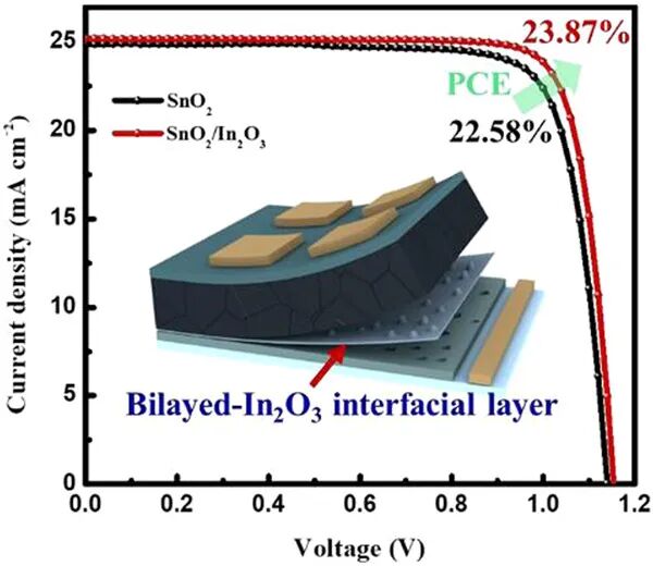 华侨大学魏展画&谢立强团队发表了以一体的双层In2O3作为界面材料制备高性能钙钛矿太阳能电池的研究成果。该研究利用In3+的水解性质,通过在基底上旋涂In(NO3)3前驱体溶液,在SnO2与钙钛矿界面之间制备出一体化的双层In2O3,这种结构由一层致密In2O3和一层纳米级棒状结构In2O3组成。由于In2O3本身优越的光电性质以及棒状结构的存在增加了电子传输层与钙钛矿的接触面积,制备出的器件的光电转化效率达到23.87%。同时,由于改善了电子提取的,抑制了载流子在界面上的复合,填充因子提升到82.14%。此外,优化后的器件具有良好的可重复性,并表现出优异的运行稳定性,在最大功率点工作超过500小时后,仍能保持80%以上的初始效率。
