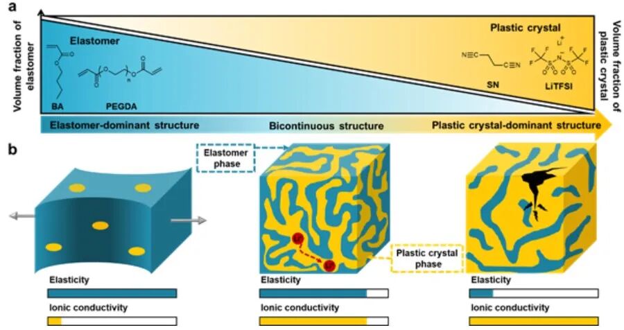 近日,韩国科学技术先进研究院Bumjoon J. Kim教授和乔治亚理工学院Seung Woo Lee教授通过系统地调节相的体积比,制备了不同相分离结构的塑晶嵌入弹性体电解质(PCEEs),以阐明PCEEs在LMBs中的结构-性能-电化学性能的关系。在弹性体相与塑晶体相的最佳体积比(即1:1)下,双连续结构PCEEs由高效的离子传导塑晶通道组成,在交联弹性体基体中能够长距离相互连接。在25°C下,表现出极高的离子电导率(~10-3 S cm-1)和优异的机械弹性(断裂伸长率≈300%)。采用这种优化的PCEEs、35 μm厚的Li负极和高载量LiNi0.83Mn0.06Co0.11O2(NMC83)正极的全电池提供了437 Wh kg负极+正极+电解质-1的高能量密度。