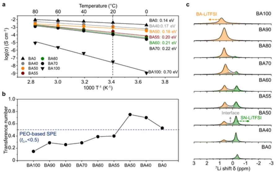 图 3、a)PCEEs、BA100和BA0的离子电导率随温度的Arrhenius图。b)PCEEs、BA100和BA0的锂离子转移数。c)PCEEs、BA100和BA0的7Li固态核磁共振谱。利用拉伸机获得了不同BA:SN体积比的PCEEs的应力-应变曲线,比较了它们的力学弹性。fSN≤0.50的PCEEs具有同样高的伸长率(断裂伸长率>300%),这归因于BA基弹性体优异的弹性(图4a)。而BA40的弹性体体积分数降低,其伸长率显著降低(断裂伸长率≈160%)。通过对PCEEs的应力-应变曲线进行积分,比较了PCEEs的韧性(图4b)。随着fSN从0.5增加到0.6,PCEEs的韧性值显著降低。因此,0.50的fSN是PCEEs具有优异力学性能的临界体积分数。BA50的高机械回弹性如图4c所示。截面积为20 mm2的BA50试样能够反复举起200g的重物并恢复原状。此外,图4d显示了PCEEs在角频率为1 rad s-1时的存储(G’)和损耗(G”)模量和损耗角正切值(由动态剪切流变测量确定)。以BA70为例,fSN为0.3时,存储模量显著超过损耗模量,反映了该PCEEs的弹性。当PCEEs的fSN从0.3(BA70)增加到0.5(BA50)时,G’和G”略有下降,但损耗正切仍小于1。当fSN进一步增加到0.6(BA40)时,模量显著减少,损耗正切增加,以致其接近1,表明失去弹性。这些结果表明,fSN=0.6是PCEEs弹性受到塑晶相体积显著影响的临界点。
