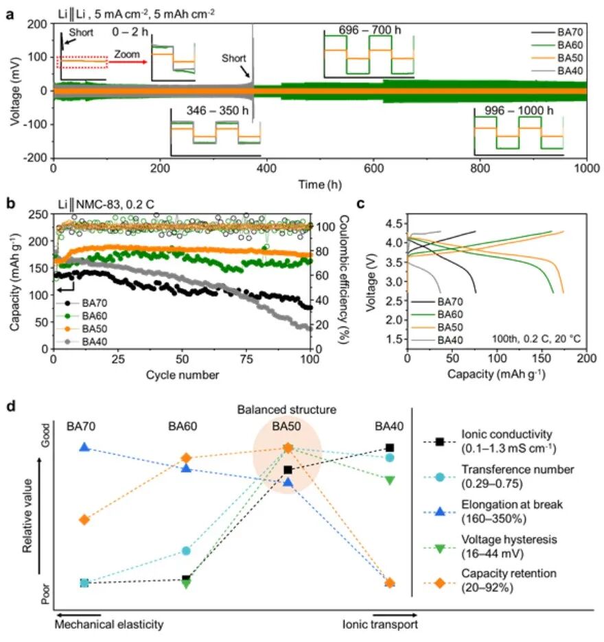 图 4、a)拉伸速率为100 mm min-1时,PCEEs的应力-应变曲线。b)通过积分(a)中PCEEs的应力-应变曲线确定PCEEs的韧性值。c)BA50试样提升200 G重物的照片。d) 在1 rad s-1角频率下,PCEEs的动态存储(G’)和损失(G”)模量和损耗正切。图5a显示,在5 mA cm-2下,BA70组装的锂对称电池在第一个循环发生短路。添加BA60的电池在1000 h时锂可逆性显著提高,但在100 h时,电压曲线呈“拱形”形状,在420和620 h后,极化有两次显著增加(图5a),这可能与枝晶或死锂的积累有关。BA50电池表现出良好的循环性能,在1000 h内极化低于10 mV。但BA40电池的力学稳定性较差,仅能维持375 h,即它不能阻止Li枝晶的穿透。通过将PCEEs与锂金属负极和NMC-83正极配对组装成全电池。100次循环后,BA70全电池容量保持率为54%(76 mAh g-1),平均库伦效率为98.9%,BA60全电池表现出更高的容量162 mAh g-1(容量保持率87%),平均库伦效率为99.3%(图5b)。BA50全电池具有188 mAh g-1的高容量,容量保持率92.4%,库伦效率高达99.5%(图5c)。然而,在100次循环后,BA40电池的容量逐渐下降到37 mAh g-1(容量保持率20%)。为了建立PCEEs的结构-性能-电化学性能关系,计算了以下参数的相对值:离子电导率、tLi+、机械弹性(断裂伸长率)、对称锂电池的电压极化,以及100次循环后全电池的容量保持率(图5d)。BA50具有优异的循环性能,锂离子输运和力学性能更为平衡,表明BA50具有最佳的PCEES结构。