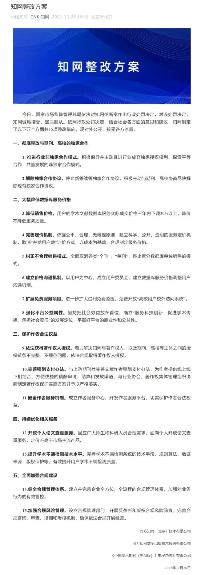 2022年12月26日,市场监管总局依法作出行政处罚决定,责令知网停止违法行为,并处以其2021年中国境内销售额17.52亿元5%的罚款,计8760万元。同时,坚持依法规范和促进发展并重,监督知网全面落实整改措施、消除违法行为后果,要求知网围绕解除独家合作、减轻用户负担、加强内部合规管理等方面进行全面整改,促进行业规范健康创新发展。