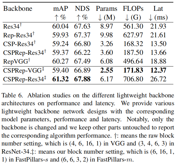 FastPillars-s和FastPillar-m模型分别建立在VGG和ResNet-34网络上。作者发现,最终性能对后期的容量不敏感,但对早期的容量非常敏感,这与FCOS LiDAR中的情况一致。因此,将FastPillers-s中VGG的块数从(4,6,16,1)更改为(6,16,1,1),FastPiller-m中ResNet-34的块数从(3,4,6,3)更改为(6,6,3,2),同时都删除了第一级中的前2×下采样。