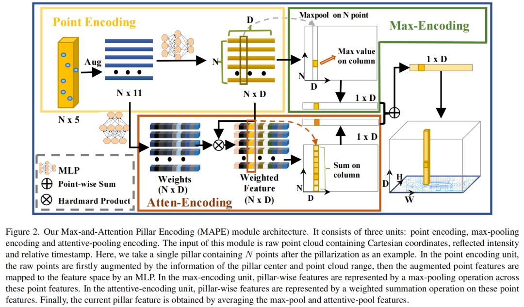 在本文中提出了一种简单但有效的Pillar编码模块,称为最大和注意力Pillar编码(MAPE),它考虑了每个Pillar的局部详细几何信息,计算负担可忽略不计,并有利于BEV中小目标(例如行人等)的性能。同时,MAPE模块的轻量级Pillar编码方法使其非常适合实时嵌入式应用。如图2所示,MAPE模块由3个单元组成: