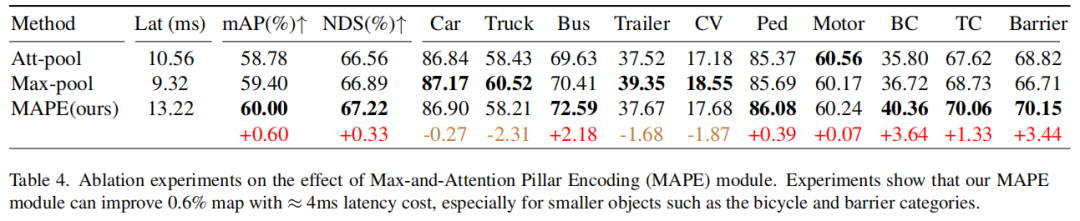 对于Pillar编码,本文提出了一种简单但有效的最大和注意力Pillar编码(MAPE)模块,该模块几乎无需额外延迟(4ms)即可自动学习局部几何图案。MAPE模块专注地整合了每个Pillar中的重要局部特征,这大大提高了小目标的准确性。