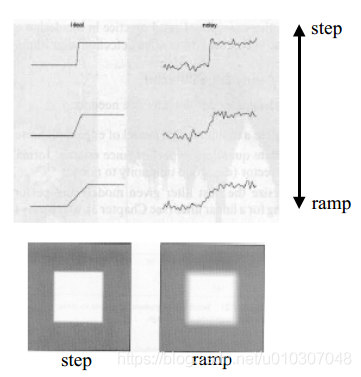 图像的边缘即明暗程度明显的像素点规则分布排列出一道线,在进行图像灰度分析中呈现明显的直角阶梯感,称为阶跃边缘。与之相较的模糊、噪声污染、曝光不均的模糊边缘,像素明暗的交替会在有限距离内发生,呈现出坡度感,故称为斜坡边缘。