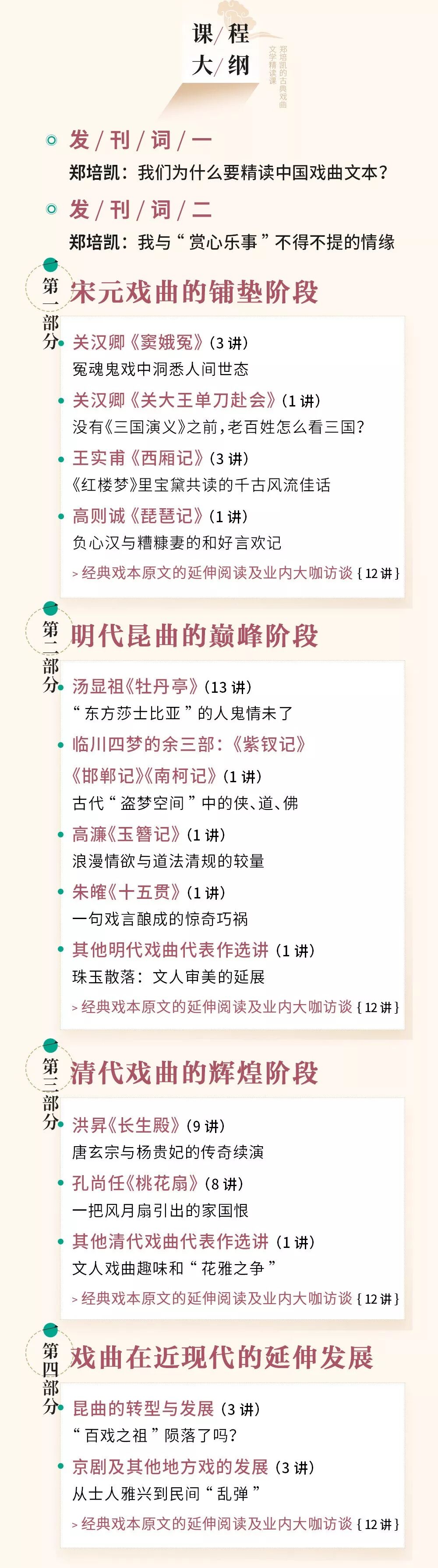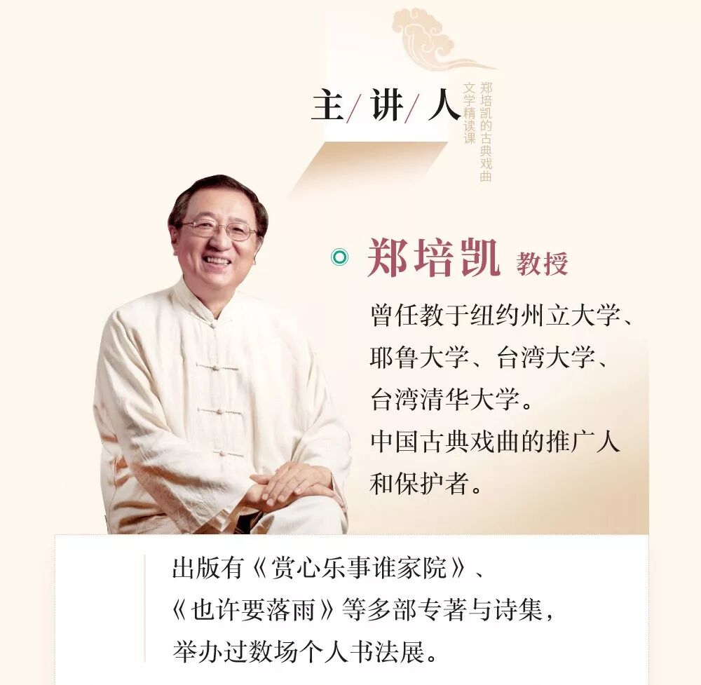 同时,你还会在课程里看到最为重磅的中国古典四大名剧——《西厢记》《牡丹亭》《长生殿》《桃花扇》,这些郑培凯教授为大家精心准备的知识内容,一定会为你带来很大的惊喜。
