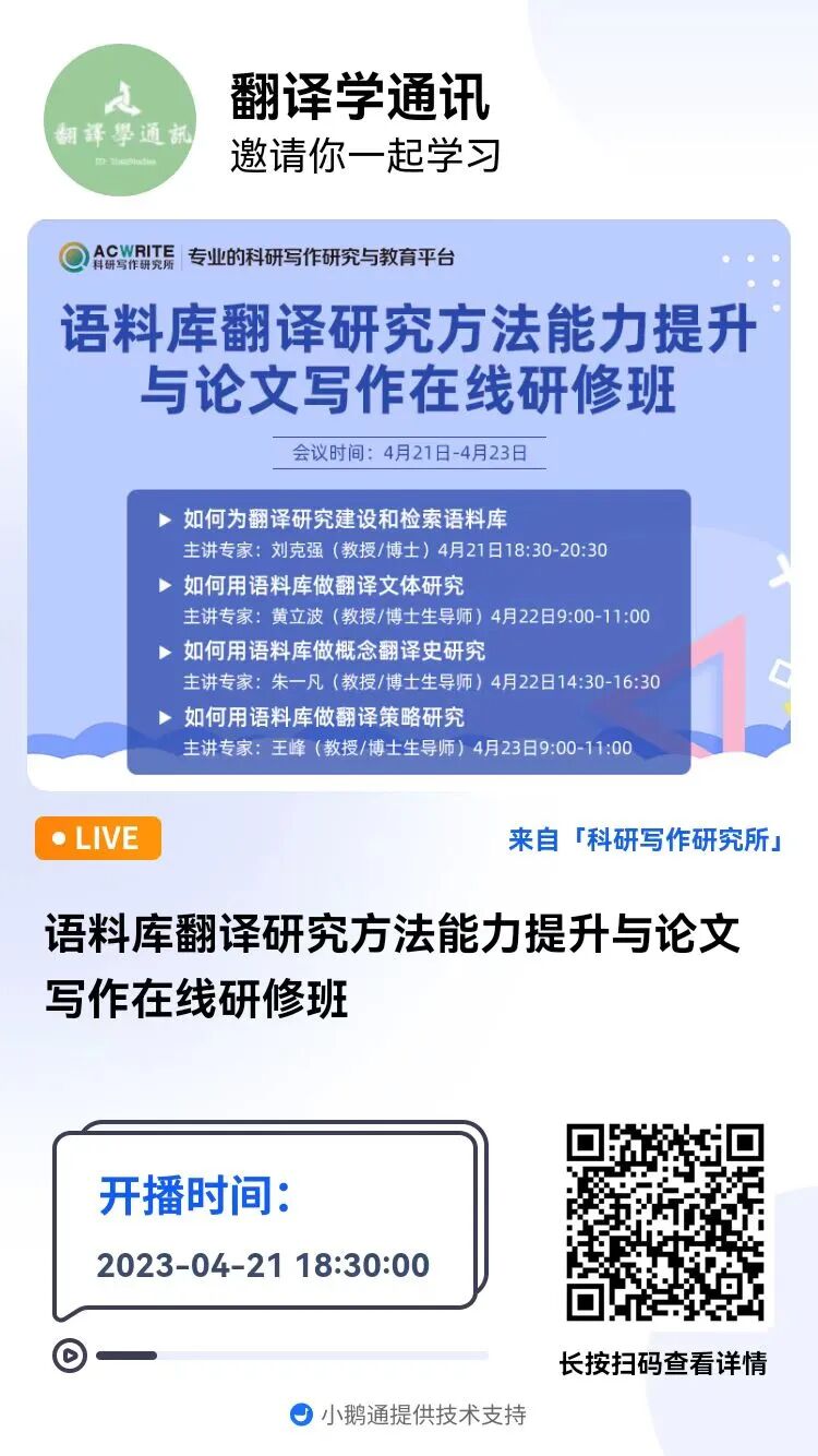 学术研修 | 4月21-23日. “语料库翻译研究方法能力提升与论文写作在线研修班”
