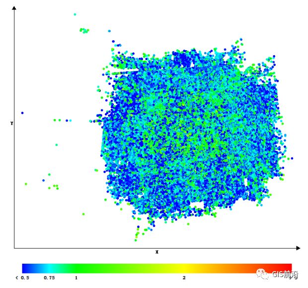 位置不确定性:所有连接点的俯视图显示,颜色代表各个点位置的不确定性。数值以米为单位,最小不确定度为0.0024米,最大值为4.0446米。平均位置不确定度等于0.0829米。