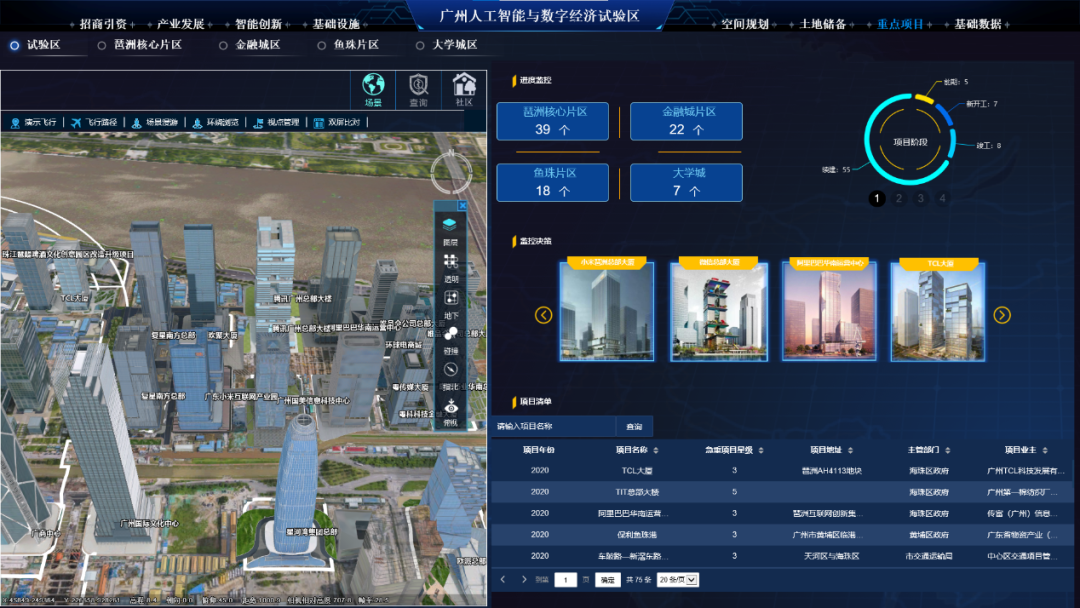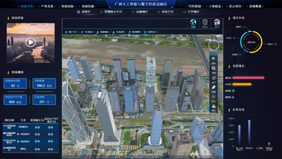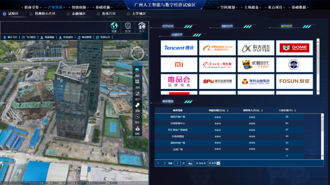 在智慧广州时空信息云平台支撑下,广州市人工智能与数字经济试验区CIM平台围绕试验区81平方公里,建立广州人工智能与数字经济试验区的地上地下一体化三维模型,实现地、楼、房、企业、人口和经济数据的全面融合挂接,建立范围内资源及建筑物分布、人口分析、基础设施配套、经济及产业分析、企业名片、重点项目统计、权属分布统计、储备土地分布等大数据模型及人机交互功能,形成CIM示范应用,实现琶洲的园区、产业、经济、企业、税收区间、重点企业总部、招商引资、重点项目建设等分层分级分类显示和统计分析功能,达到对试验区整体把控的要求。