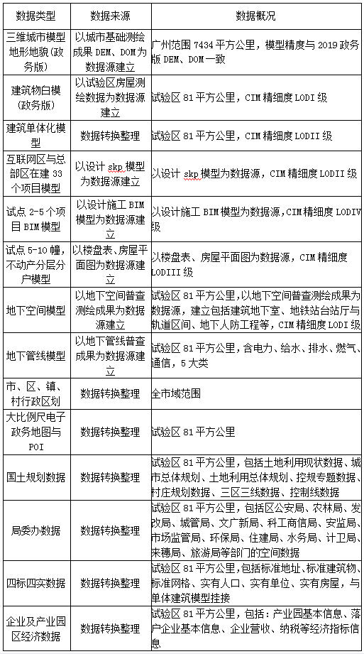 在广州人工智能与数字经济试验区81平方公里内建设地上地下二三维一体化CIM实体专题实体数据,包括地形地貌、建筑物白模、三维实景单体模型、互联网区与总部区在建项目模型、试点项目BIM模型、试点不动产分层分户模型、地下空间模型、地下管线三维模型;二维专题数据库包括大比例电子政务地图与POI、国土规划专题、四标四实专题、企业及产业园区经济专题、不动产管理专题、重点项目专题等空间数据。