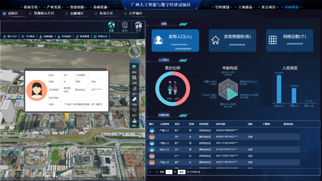 实现试验区范围内人口、房屋和网格的上图,并对试验区范围内人口性别比例、年龄构成和人员类型(流动人口、户籍人口和境外人员)进行统计分析。形成“人-地-房-网格”管理模式,进一步支撑拆迁分析,自动生成任意拆迁范围内涉及的人口、土地和楼房等情况分析报告,支撑城市综合管理和整治。