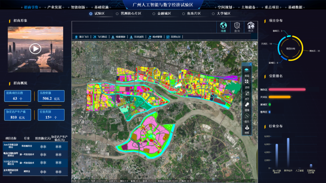 整合了试验区范围内规划设计方案三维模型、占地范围、功能布局、重点产业,交通设施、土地供应、公服设施、空气质量等数据,以最吸引眼球的方式向投资者介绍琶洲地区未来发展的方向。