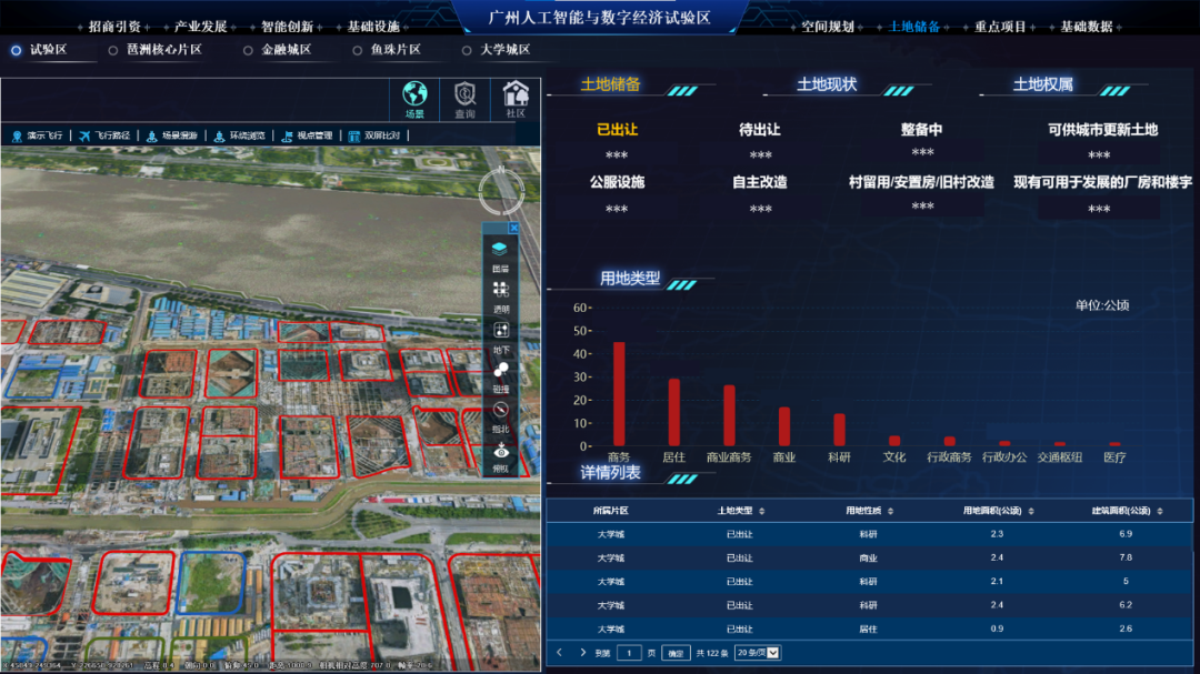 囊括了土地出让信息、用地类型信息、土地现状信息、公服设施信息等数据,实现地块综合分析,能有效为项目进驻提供土地使用方面的支撑,支撑人工智能与数字经济试验区招商引资。