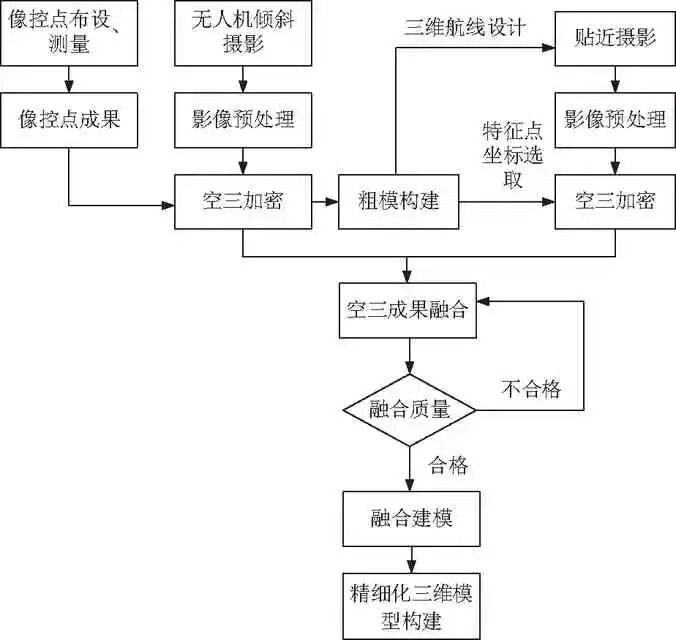 ⑤融合精细化建模。基于合并后的空三加密成果,使用建模软件进行精细化模型构建。整体技术流程如图2所示。