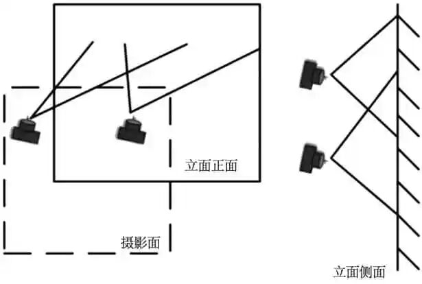 贴近摄影测量是以物体“面”为对象,利用无人机或其他拍摄设备贴近物体表面摄影,获取(亚厘米级)高分辨率影像,并进行摄影测量处理,从而恢复被摄对象的精确坐标和精细形状结构。相对于倾斜摄影测量,贴近摄影重点在于在适当的角度下近距离拍摄建筑侧面,获取的建筑立面信息更完整,纹理细节更丰富,实现其他摄影测量无法达到的精度要求。贴近摄影原理如图1所示。