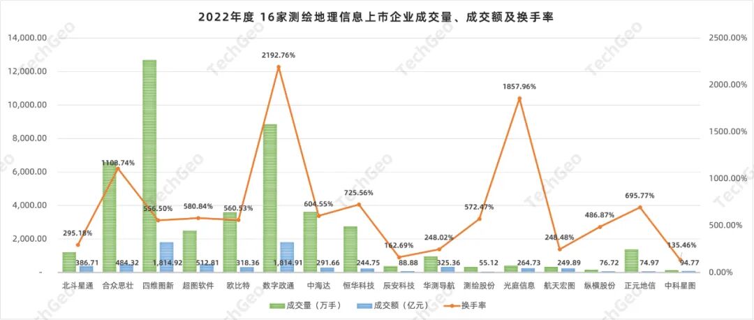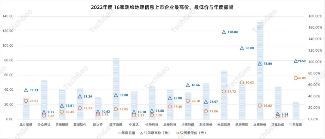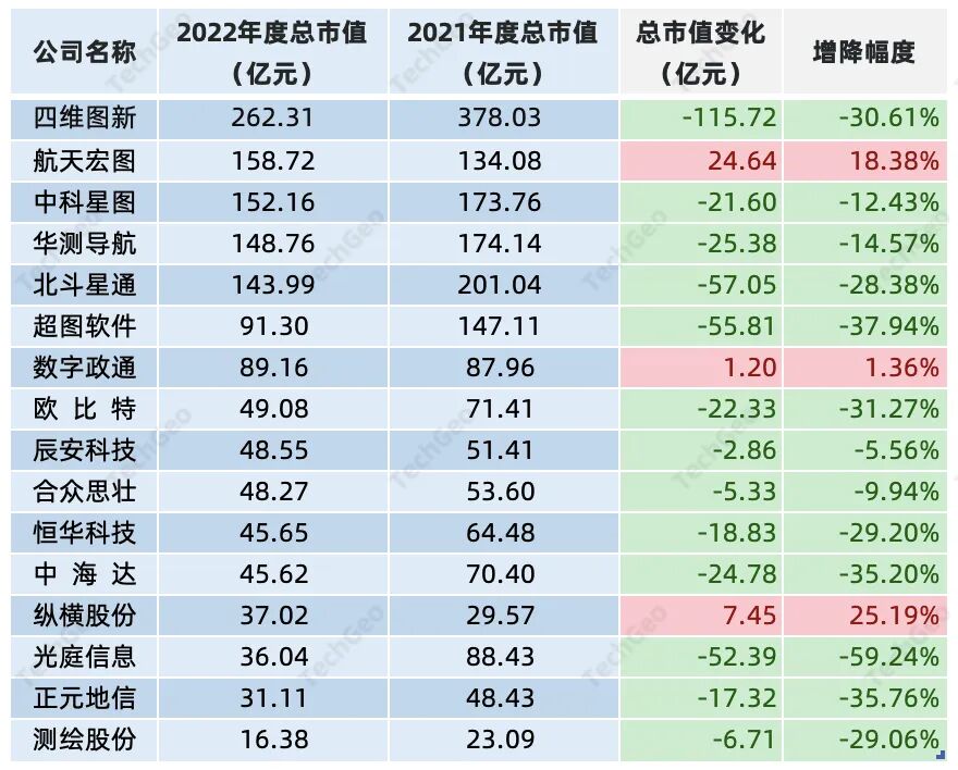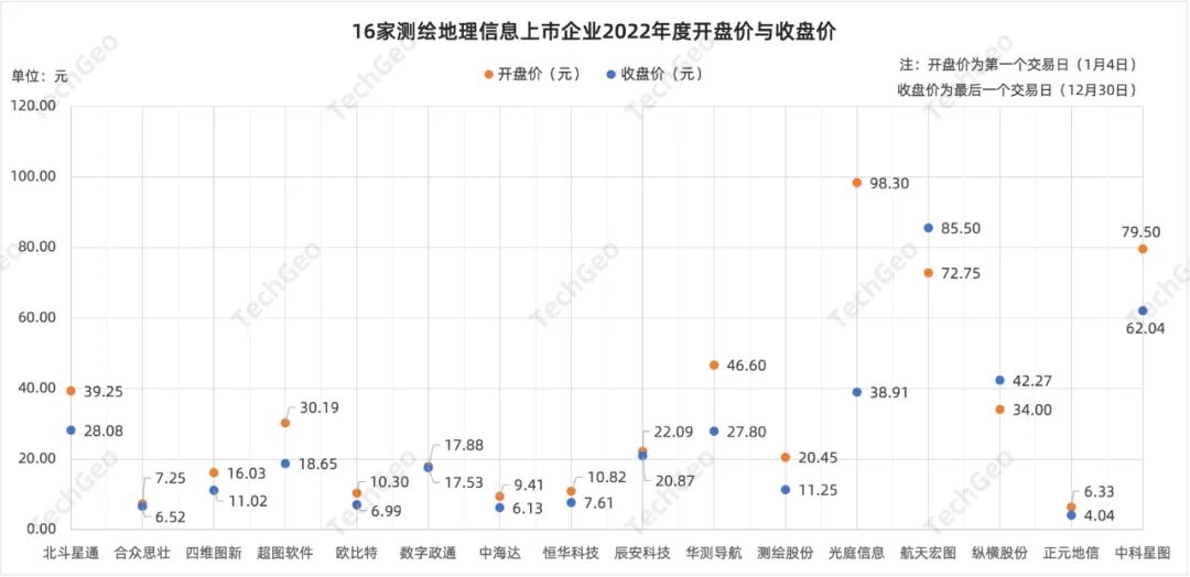 那么,测绘地理信息上市企业在2022年度的表现如何呢?我将对TechGeo持续跟踪的16家上市企业进行统计和分析,并与2021年度的情况做简单比较,为大家了解测绘地理信息上市企业在过去一年的股市表现提供参考。