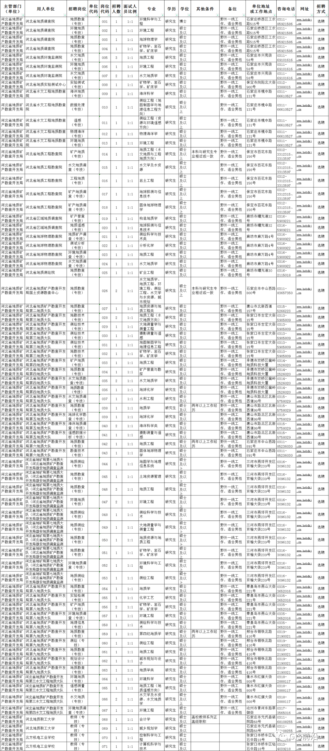 在河北省地矿局网站(www.hebdkj.cn)发布招聘信息。根据实际情况,由河北省地矿局或招聘单位在相关高校或媒体、目标单位等宣传招聘信息,到开设相关专业的高校或目标单位参加双选会等方式开展。