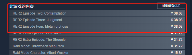 依稀记得那时一个夏促的下午,我逛着生化危机的页面,猛然发现《启示录2》居然只要4块钱!自以为捡漏了的我光速购买开玩,才发现4块钱只是第一章的“体验券”,后续三个章节痛宰我上百!![]()