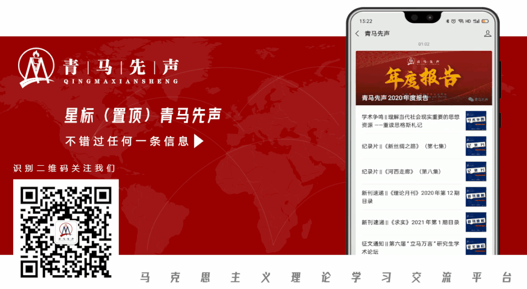 About Feature 青马先声(Marxist Youth Voice)是高校师生组成的公益性学术团队,是青年马克思主义者的聚集地,共建覆盖全国各高校本硕博及教师在内的马理论研学社群。本号刊发马克思主义理论所属二级学科最新研究成果,准确高效快速地传递学术信息。
