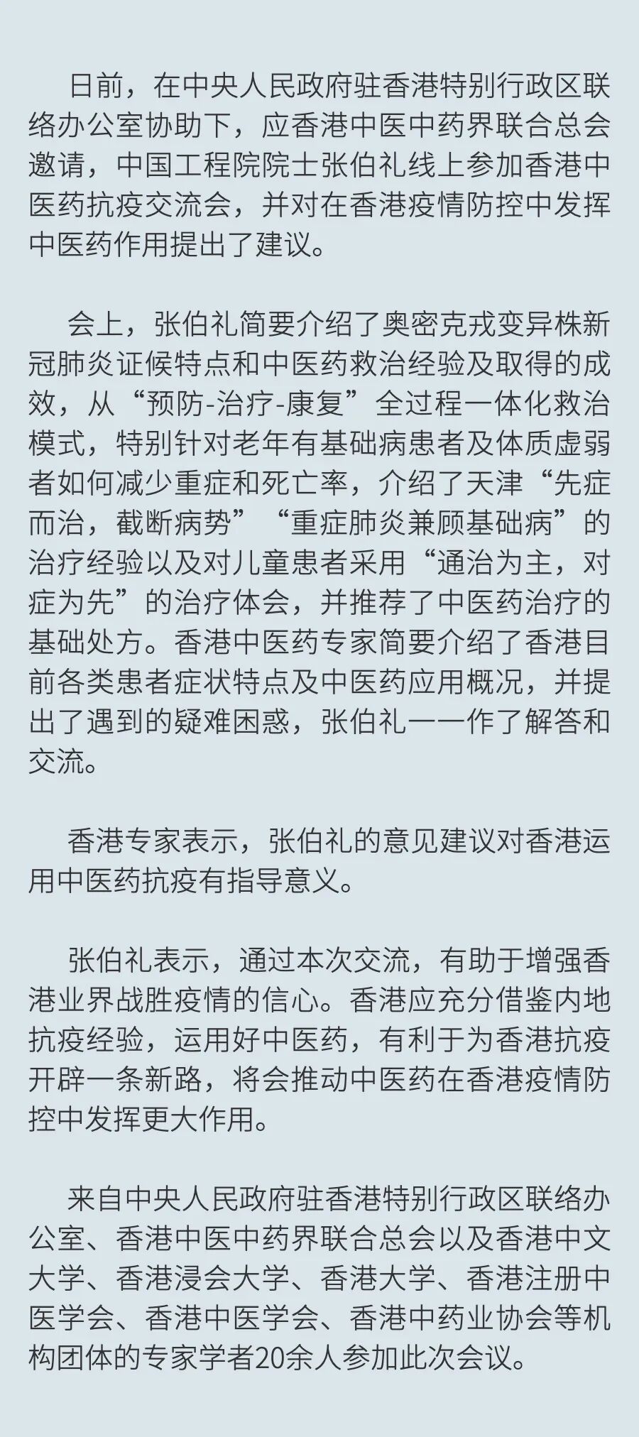 陈肇始表示,中医药是香港医疗体系的重要部分,衷心感谢中医药界一直同心同德,配合特区政府的防疫抗疫策略,特别是在第五波的抗疫战中,中医药全方位广泛深度参与,在疫情的预防、治疗以至复康的全过程中,发挥重大作用。