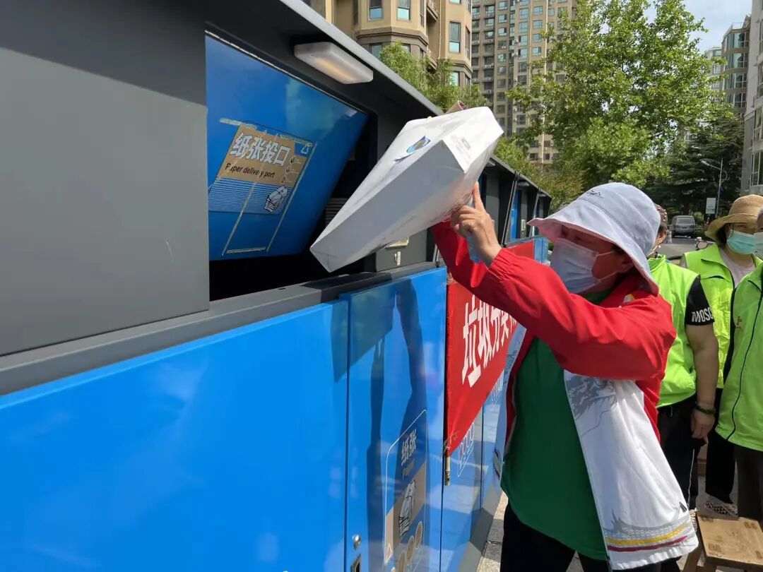 通过积分兑奖、现场讲解等多种宣传方式,持续推进垃圾分类试点工作。图为海景苑小区居民投递纸类垃圾。
