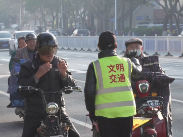 文明交通协管员在城区主要路口协助交警执勤,提醒市民们注意遵守交通规则,不越线、不闯红灯。