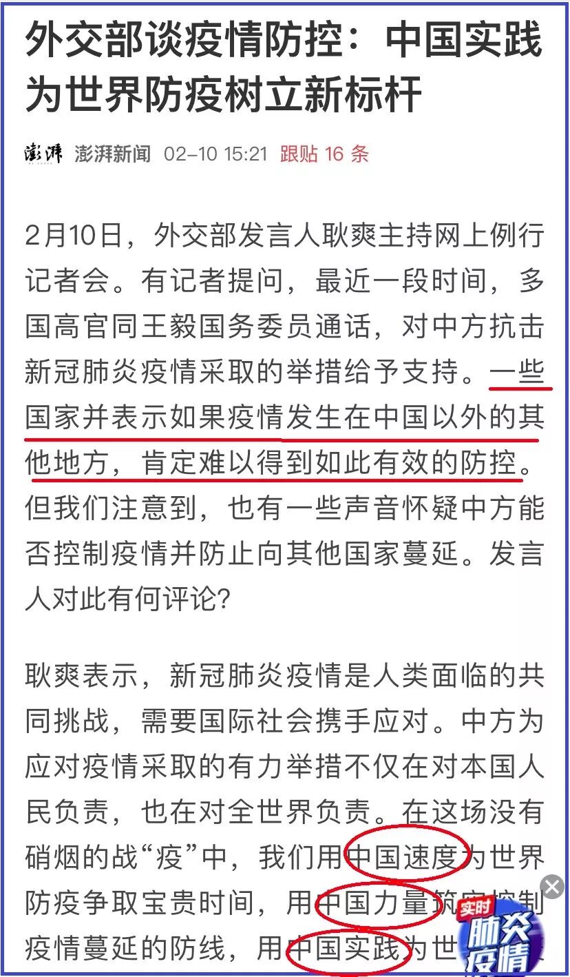 比如提到“一些国家表示,如果疫情发生在中国以外的地方,肯定难以得到如此有效的防控。”虽然濠哥不知道作出这些表示的国家是谁、都有谁,但肯定有,对吧!重要的是,在中国之外,也有能够如中国般有效防控,甚至比我们更有效防控的国家吗?濠哥认为,最有可能的答案是:没有!一是将中国防疫提高到全球意义上。中国现在进行的疫情应对,不仅是对自己国人,也是对全世界、对全人类的负责行动。一句话,就将一场灾难转化成负责任大国的可敬之举。