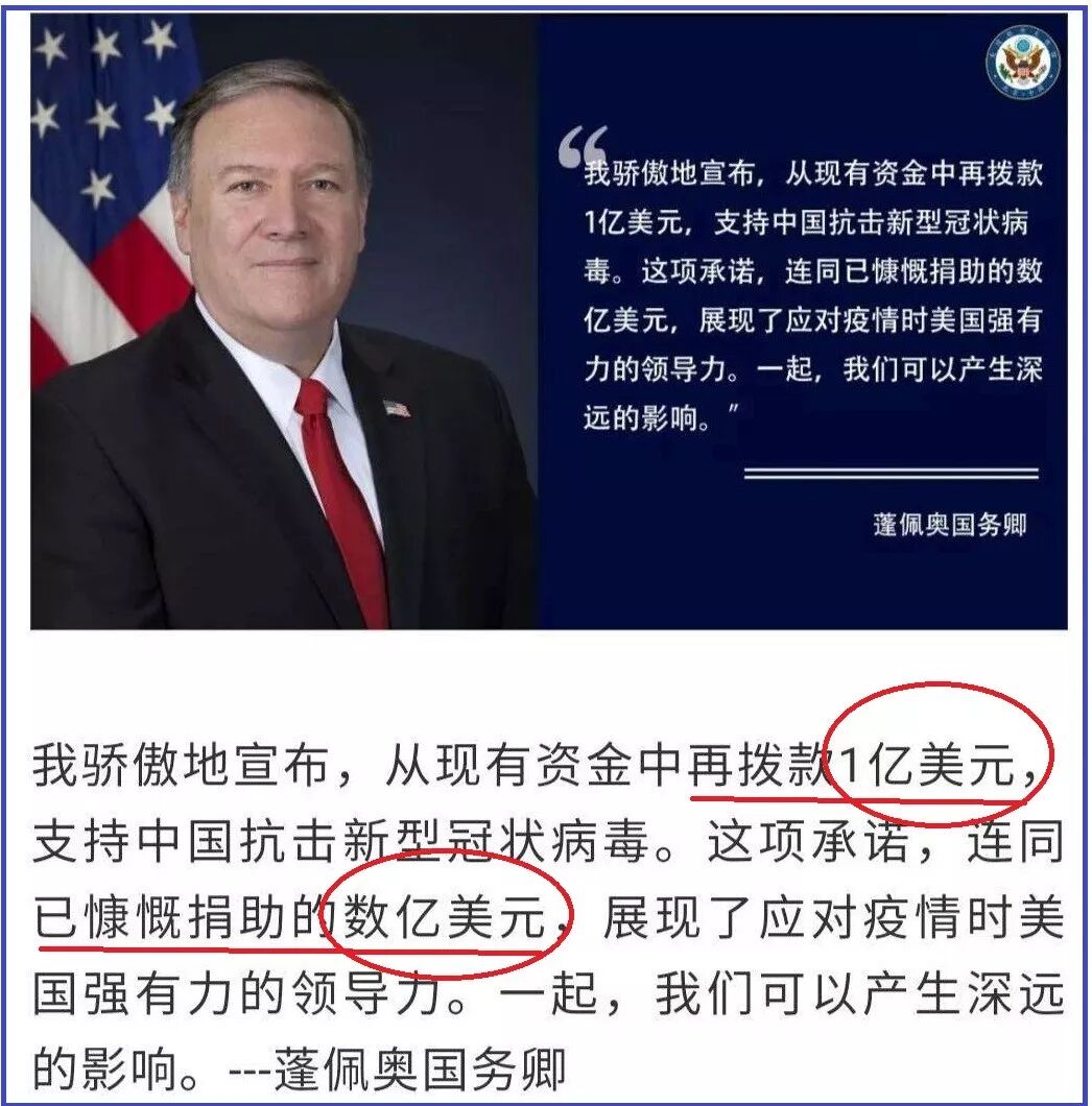 美国国务院发言人奥特葛斯大言不惭地表示,美国是世界上最慷慨的捐助方,今后将依然如此。我们鼓励世界其他各方向我们看齐,做出应有的承诺。但,事实是,伴随着上述所谓的对华援助,美国一些官员对中国防疫的抹黑和攻击也在同时进行。另外,美国政府宣称的那些援助,主要是美国企业、慈善机构和个人及华侨组织和进行的,美国政府声称的一亿美元援助至今没有音信。