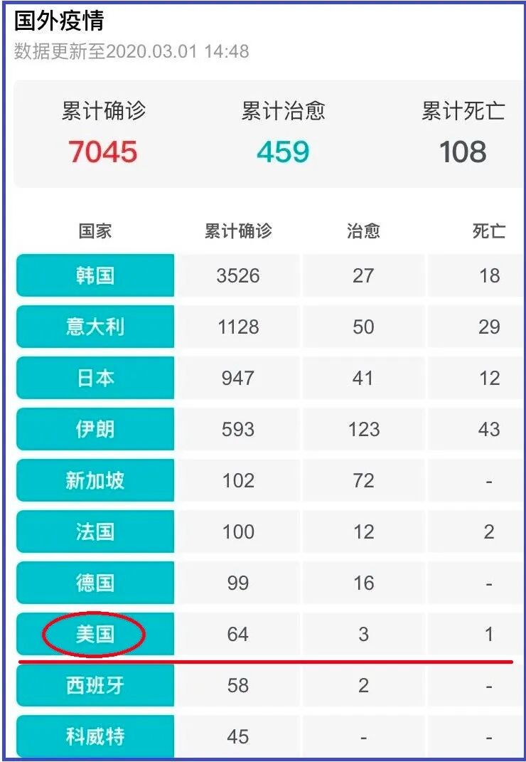 截止3月1日,作为较早报告感染病例的人口大国,美国目前的疫情仅排在大陆之外的、世界最严重前十位国家中的第八。报告病例数不足百例,显示美国在卫生防疫领域还是有一些实力和优势的。![]()