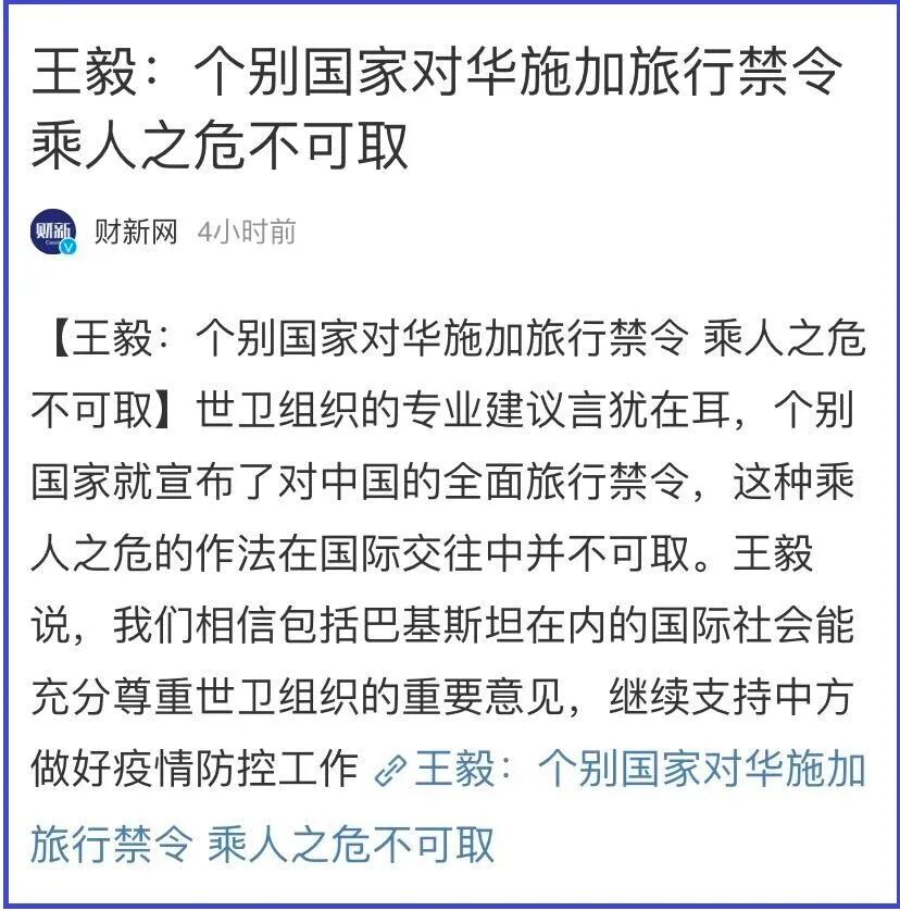 1月31日,特朗普政府宣布美国进入公共卫生紧急状态。 当天,特朗普签署命令,除美国公民和永久居民以及他们的直系亲属之外,禁止所有在过去两周到过大陆的人入境。据纽约时报统计,截至1月31日,在大陆之外,泰国报告了14个感染病例;日本11例;香港特区和新加坡各10例;台湾地区8例;澳大利亚、马来西亚和澳门特区各7例;法国和美国各6例。虽然美国方面在1月20日武汉疫情正式公开后,一再要求向中方派出专家医疗队,但我方未予理睬。![]()
