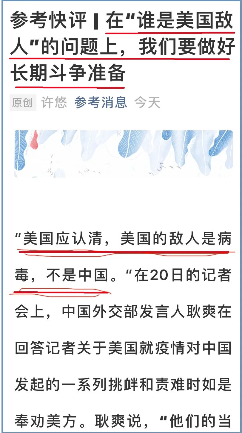 参考消息的一篇文章称,疫情开始至今,美国政府在应对疫情的准备方面纰漏百出,捉襟见肘,在抗击疫情的行动上推诿塞责、拖沓迟缓,这些都是有目共睹的;而在攻击中国方面,却是行动迅速、花样翻新。“认清美国的敌人是病毒,而不是中国”,对他们似乎是“不可能完成的任务”。