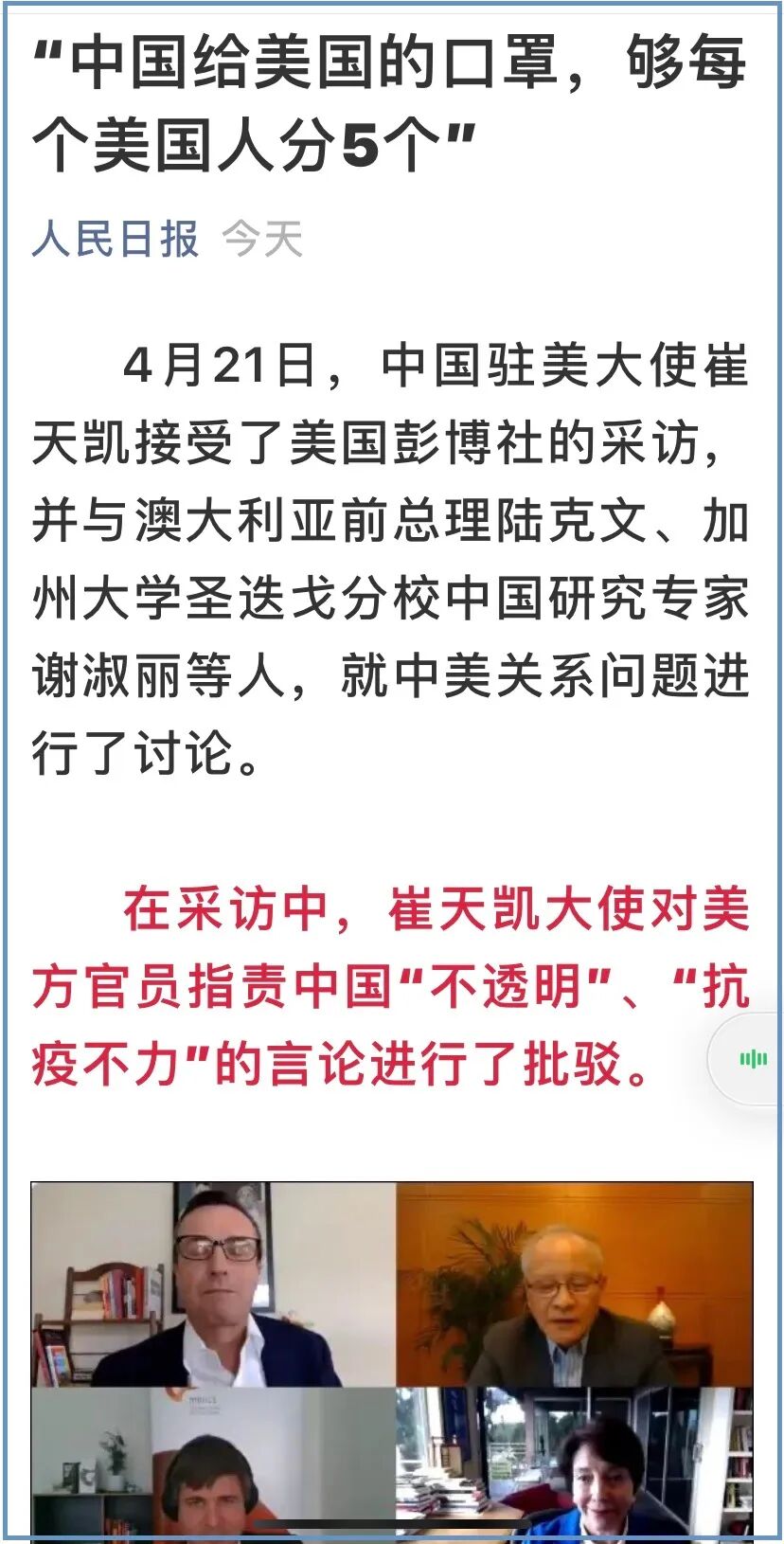 文章说,病毒疯狂肆虐,中国主张合作。但是美方却专注造谣污蔑中国。原因是: