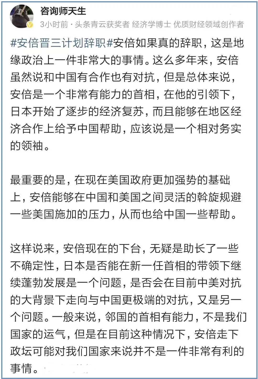 可以说,安倍因病去职,几乎是将中日关系一个最大政治稳压器给拆除了。![]()