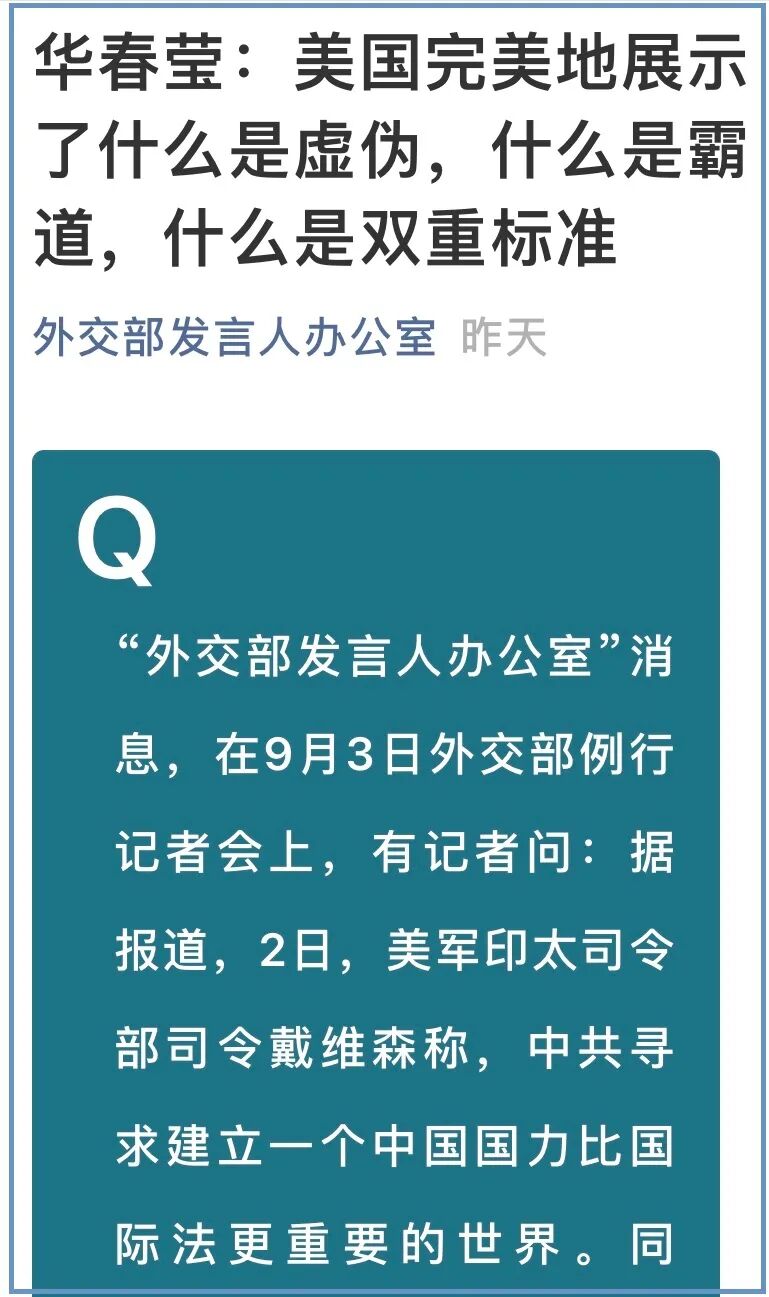 如果以这两天的微博内容看,除了正常的介绍我方主要外事活动和宣布政策立场之外,外交部当下最重要的工作就是斗争美国。这是一条以行动制造的下滑轨道:因为美国很坏,所以我们斗争美国;因为我们斗争美国,所以中美关系越来越坏。看来中美为敌,除了客观必然性和主观预期所致之外,还是一个中美双方彼此踩踏、相互升级,以致螺旋式下滑的结果。至此,中美关系继续恶化,更加恶化,既得到了实践证明,也得到了理念支持,可以确认、无疑了。![]()