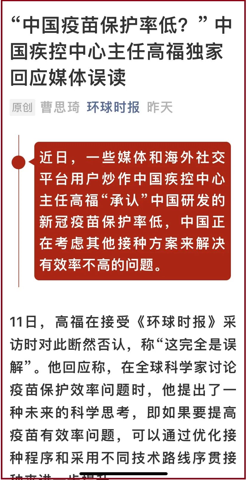 中国疾控中心主任高福11日接受采访表示,他在上周六新闻发布会上有关疫苗的介绍被一些外媒故意曲解。他提供的是一种提高疫苗有效率的思路,但被恶意解读为中国疫苗有效率低。高福说:“全球的疫苗保护率测试数据都有高有低,如何提高疫苗的保护率,这是需要全球科学家考虑的问题。”