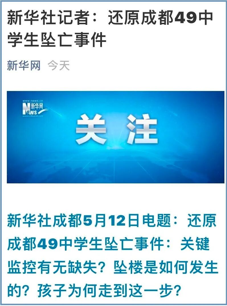 正如这篇新华社通稿在导语中所说,报道是为还原成都49中学生坠亡事件:关键监控有无缺失?坠楼是如何发生的?救护车有没有及时赶到?孩子为何走到这一步?等等。
