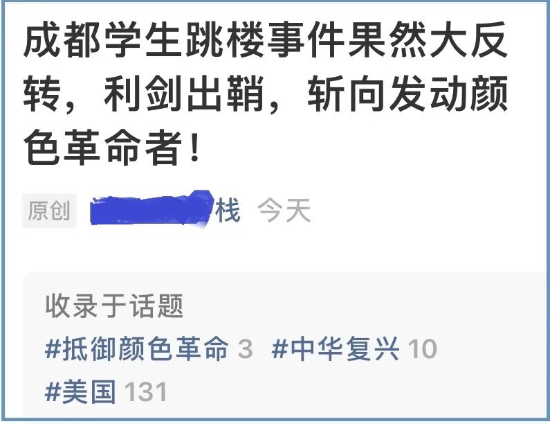 以这样的眼光和角度,看待发生在武汉和成都的两起事件,当网友们追问为何真相总是姗姗来迟的时候,还应该追问:在真相姗姗来迟的背后,当事人的权益发生了什么变化?他还有可能、有能力、有证据追究责任与追索赔偿么?濠哥认为,这是老百姓在这些事件与类似事件中,总是迟迟等不来真相的真相。但是,还得继续写一个让人困惑与难过的问题:就是在成都中学生坠亡事件发生的这几天,移动互联网与社交媒体上,忽然平地掀起了一阵妖风,说全国网友们围绕这一事件引发的关注与质疑,是成都发生了“颜色革命”。![]()