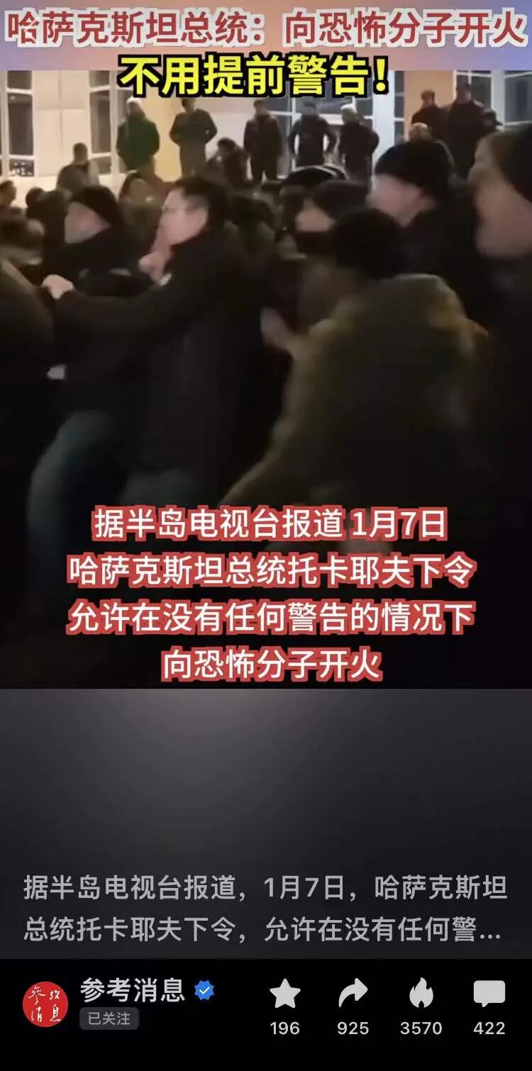 那么,哈萨克斯坦因天然气价格上涨一倍引发民众抗议并迅速升级为一场政治动荡,是不是某种程度上的有色G命呢?两千多年前,一位我国著名先哲在他的《孟子》一书中写道:“君之视臣如手足,则臣视君如腹心;君之视臣如犬马,则臣视君如国人;君之视臣如土芥,则臣视君如寇仇。”到目前为止,据相关的报道,现任哈萨克斯坦总统托卡耶夫是把抗议示威群众当“匪徒”来看待的。![Пресс-конференция К-Ж. Токаева после оглашения предварительных итогов выборов]()