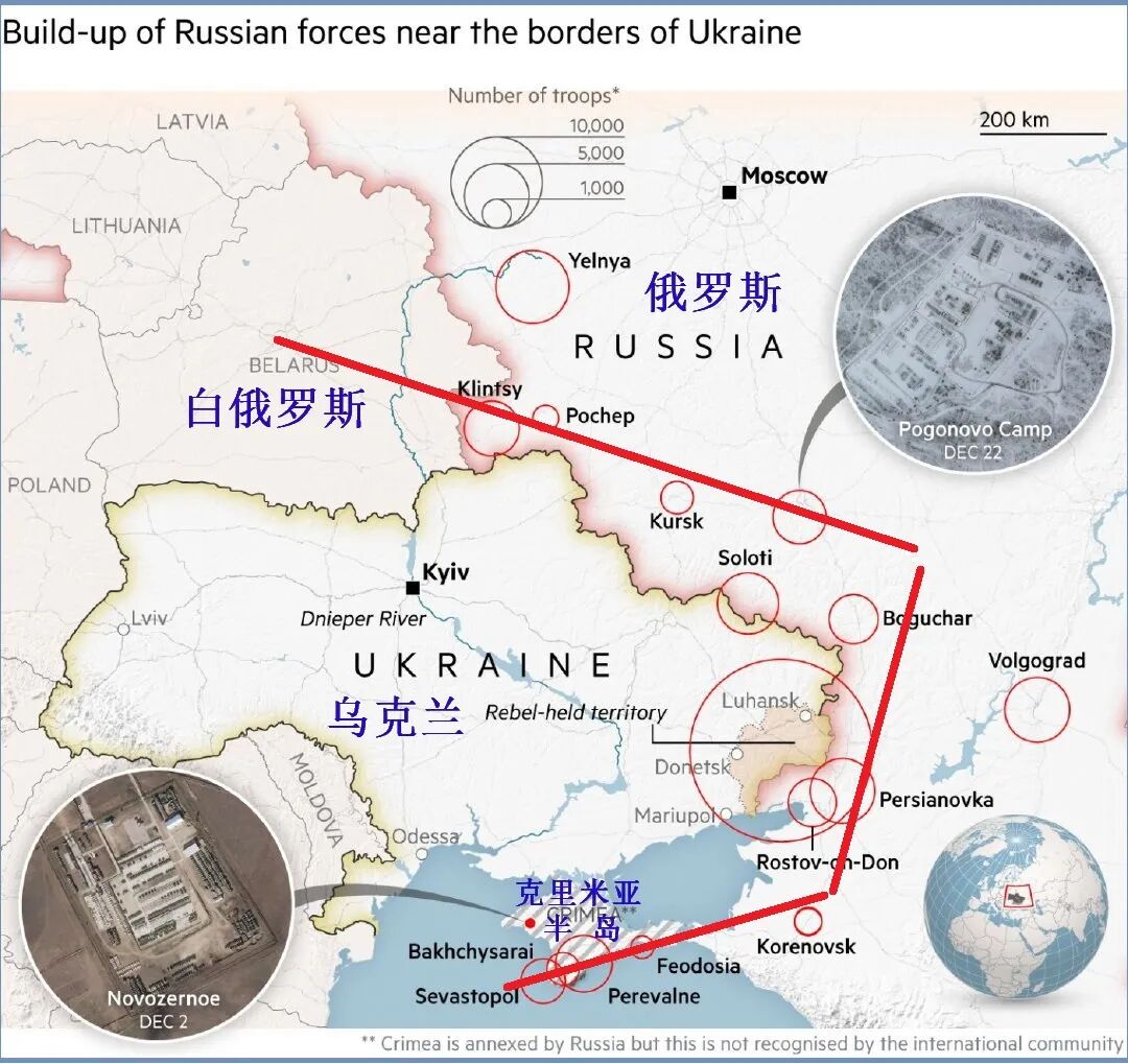那么,俄罗斯从北(白俄罗斯)、东(乌克兰顿巴斯地区)、南(克里米亚半岛)三个方向完成对乌克兰东部地区的军事包围,意欲何为呢?