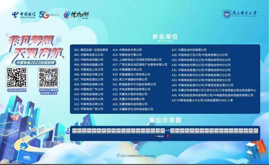 本次招聘系中国电信集团2023届秋季校园招聘会首站,携旗下各省市公司和专业公司共47家,提供近千岗位,我校超过千名毕业生参加了双选会。