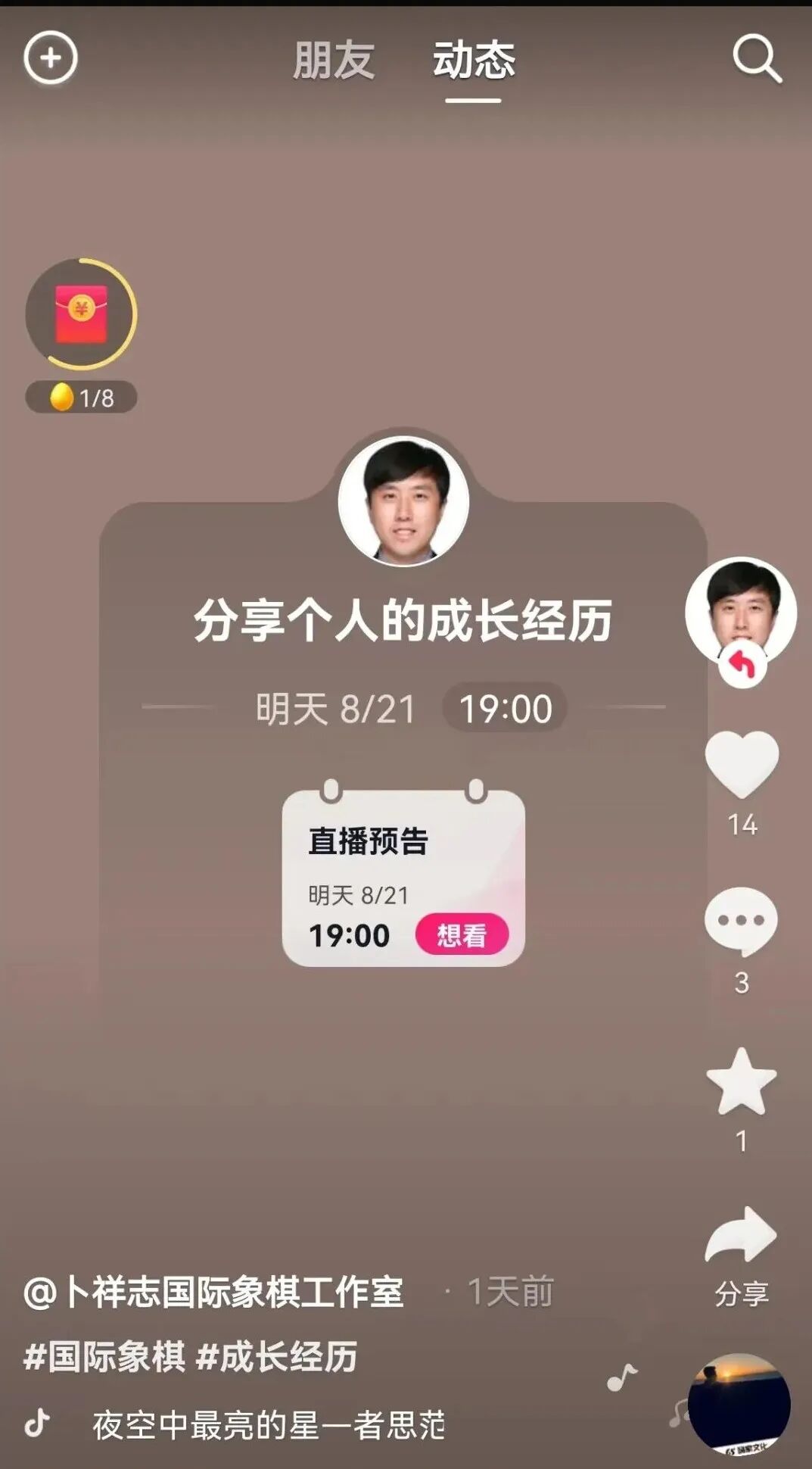 卜大师的抖音号在奥赛期间恢复更新,8月21日晚19时将直播,欢迎前去捧场。