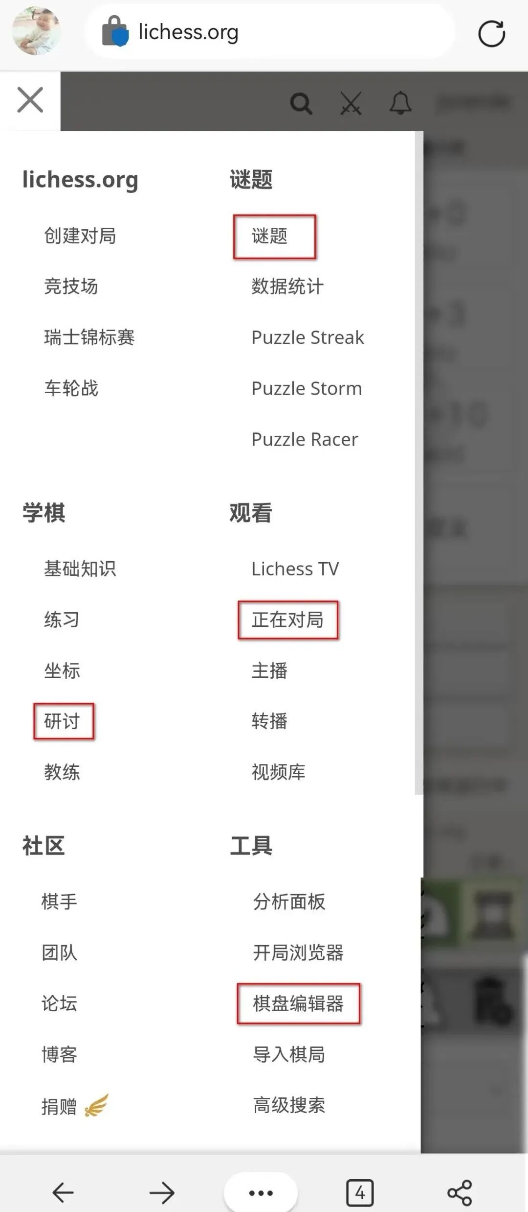 点开左上角后会出现菜单,重点看看谜题、研讨、正在对局、棋盘编辑器这几个选项。