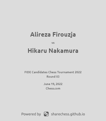 Firouzja 费鲁兹贾vs. Nakamura 中村光(1/2-1/2), Candidates Tournament (http://go.chess.com/Firouzja-Nakamura)