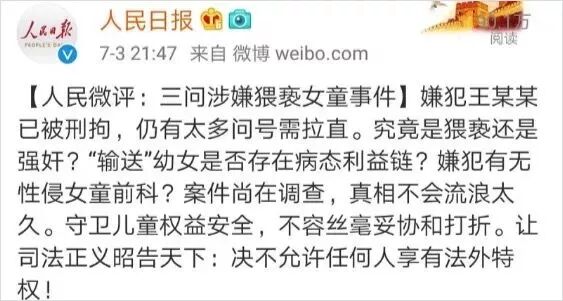 人民日报发出了三个追问:“猥亵还是强奸?”“输送幼女是否存在病态利益链?”“疑犯有无性侵女童前科?”,并强调了不允许任何人享有法外特权。