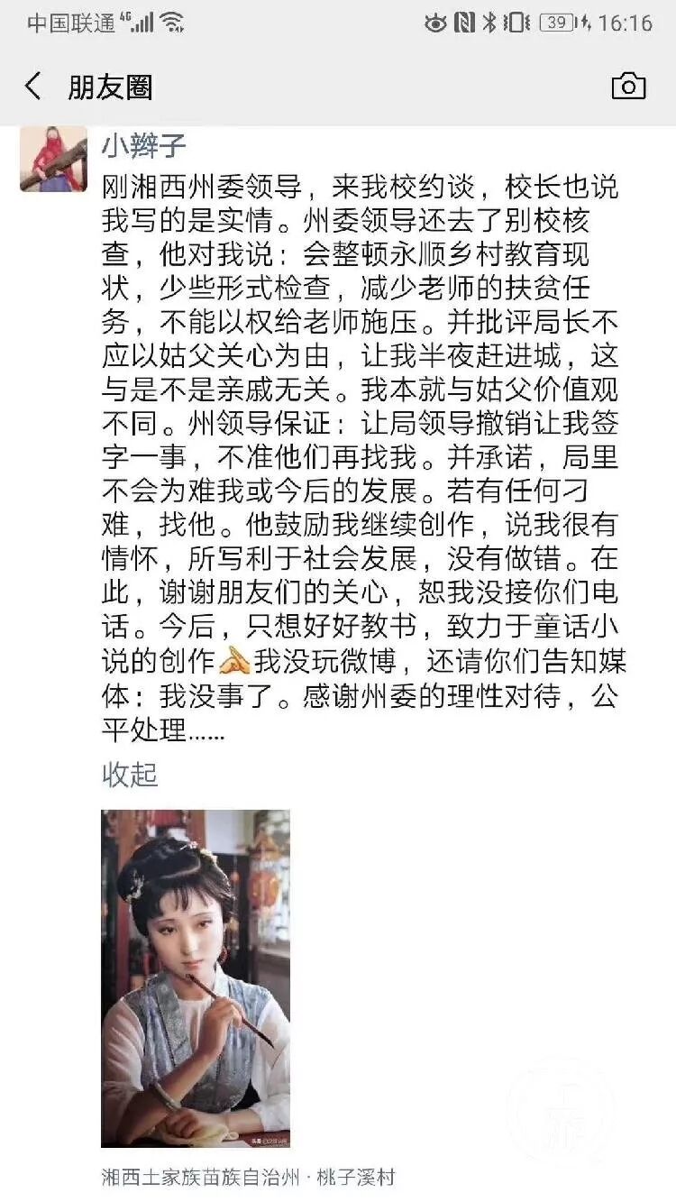 李田田说,州委领导鼓励她继续创作,说她很有情怀,所写的利于社会发展,没有做错。在此,她谢谢所有关心她的朋友们。