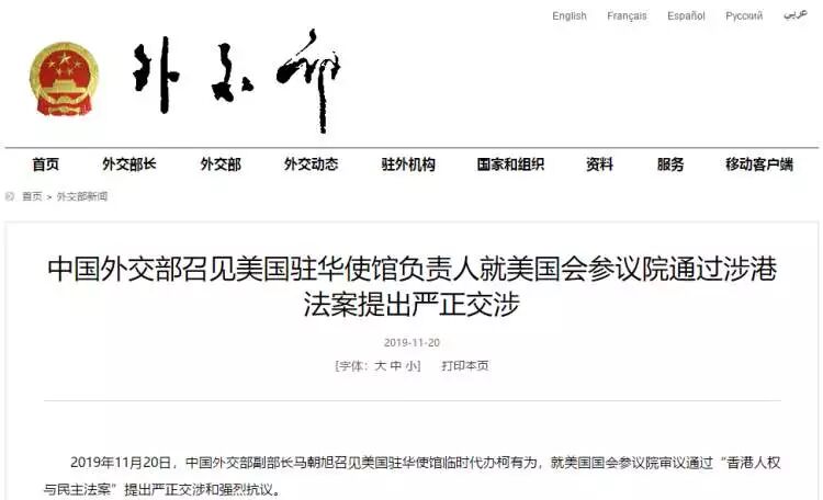 第二件事是美国参议院于(当地时间)11月19日审议通过了“香港人权与民主法案”。