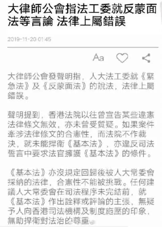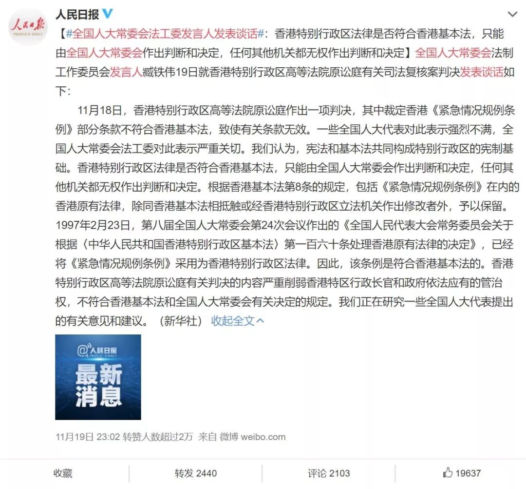 11月18日香港高等法院宣布《禁蒙面法》违宪后,全国人大法工委于19日明确表态称,香港特别行政区法律是否符合香港基本法,只能由全国人大常委会作出判断和决定。